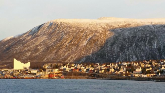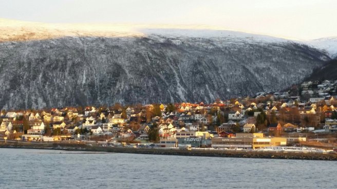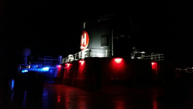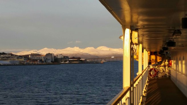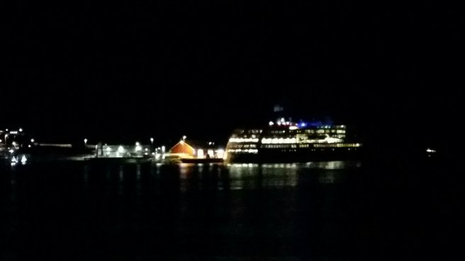 From the centre of the bay, Bergen city looks like a golden necklace of lights stretching in nearly 360° around the horizon. So magical, but it was freezing up there on deck 9.