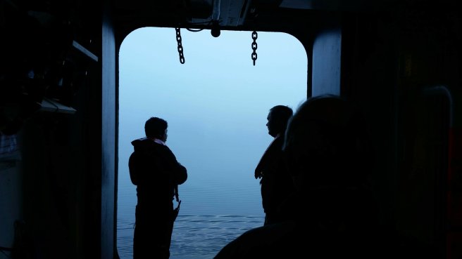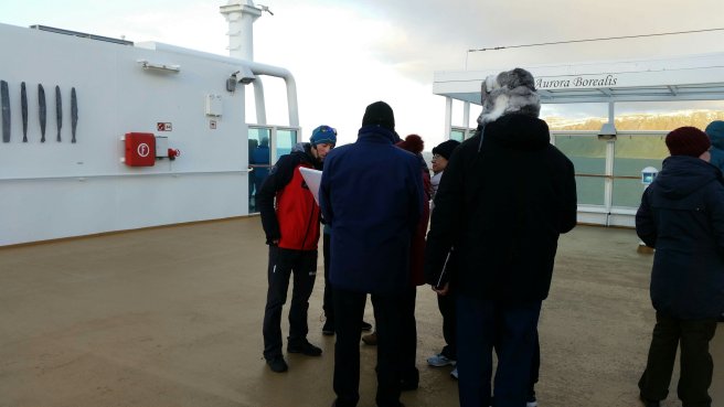 Most of the day’s excitement would happen for me after dark, but I did spend a bit of time strolling about on deck with Ellen (one of my dinner table mates), trying to pay attention to the information given by the ever-enthusiastic Julien (the expedition team advisor on nature and culture)…