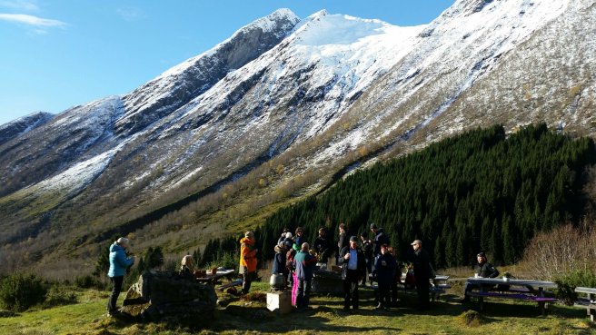 The group gathered for a Norwegian-style picnic begore a final explore and hike downhill to the pier at Urke.