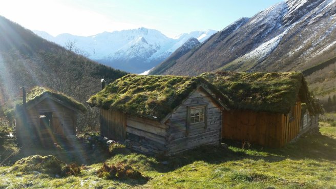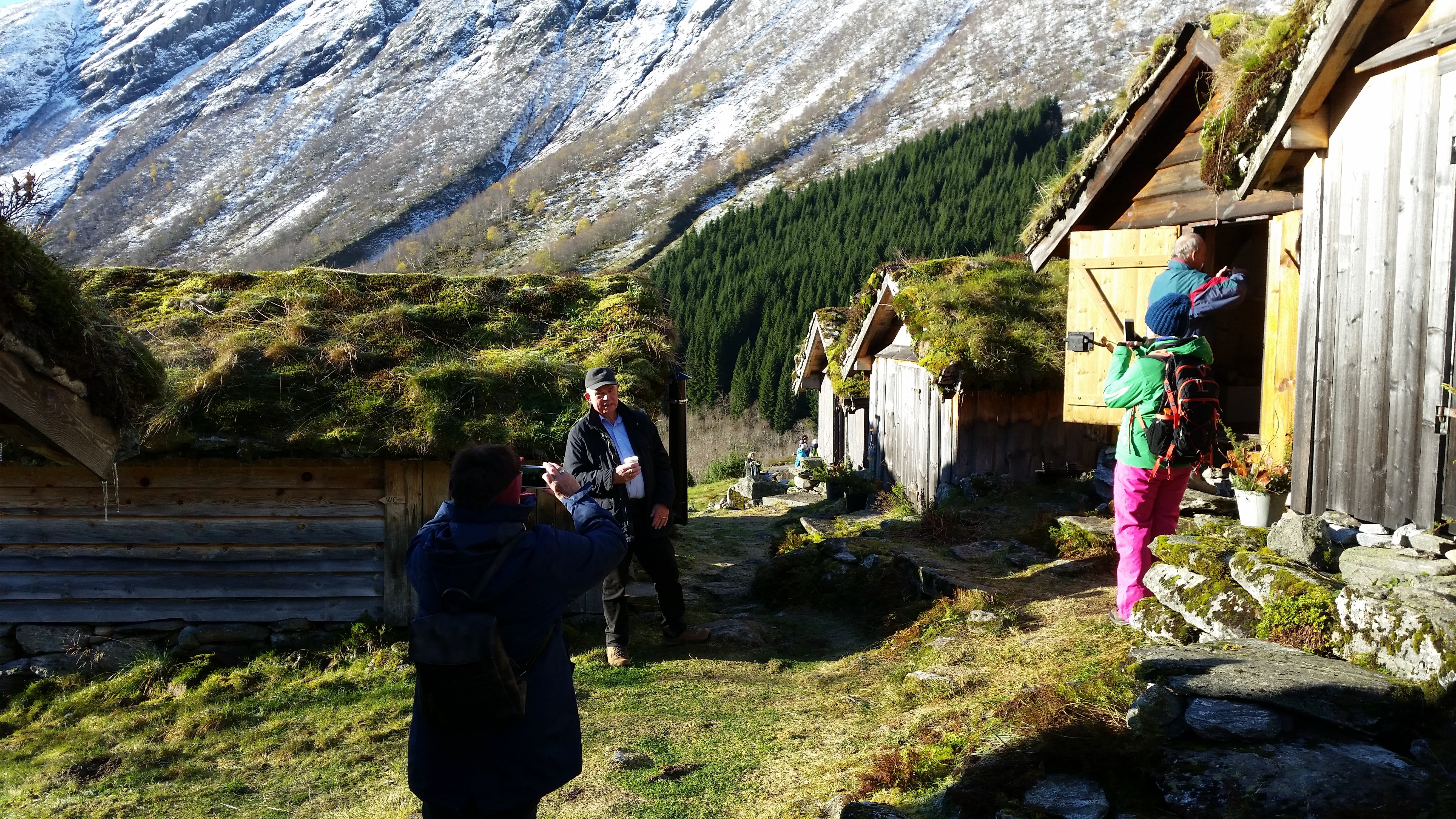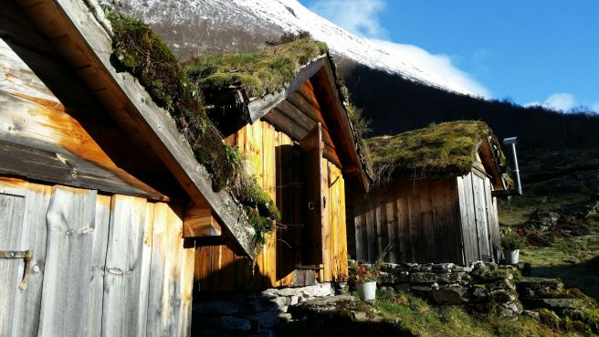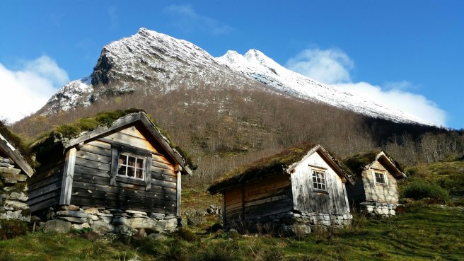 …and we arrived in the Hjørundfjord, by Urke, where I had decided to go on an excursion walking inland and up the mountain to a historic summer farm where shielings (little houses for dairy maids to live in) had been rebuilt after an avalanche destroyed the original summer settlement.