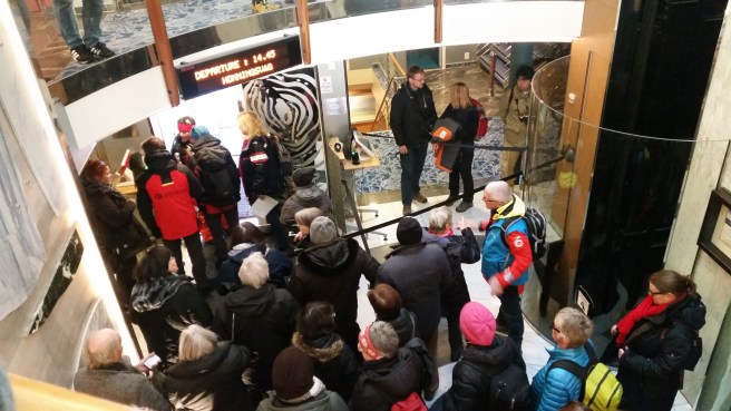 The ship can’t get close to the shore at Urke, so everyone going ashore squeezed into the cargo hold to wait for the tender boat.