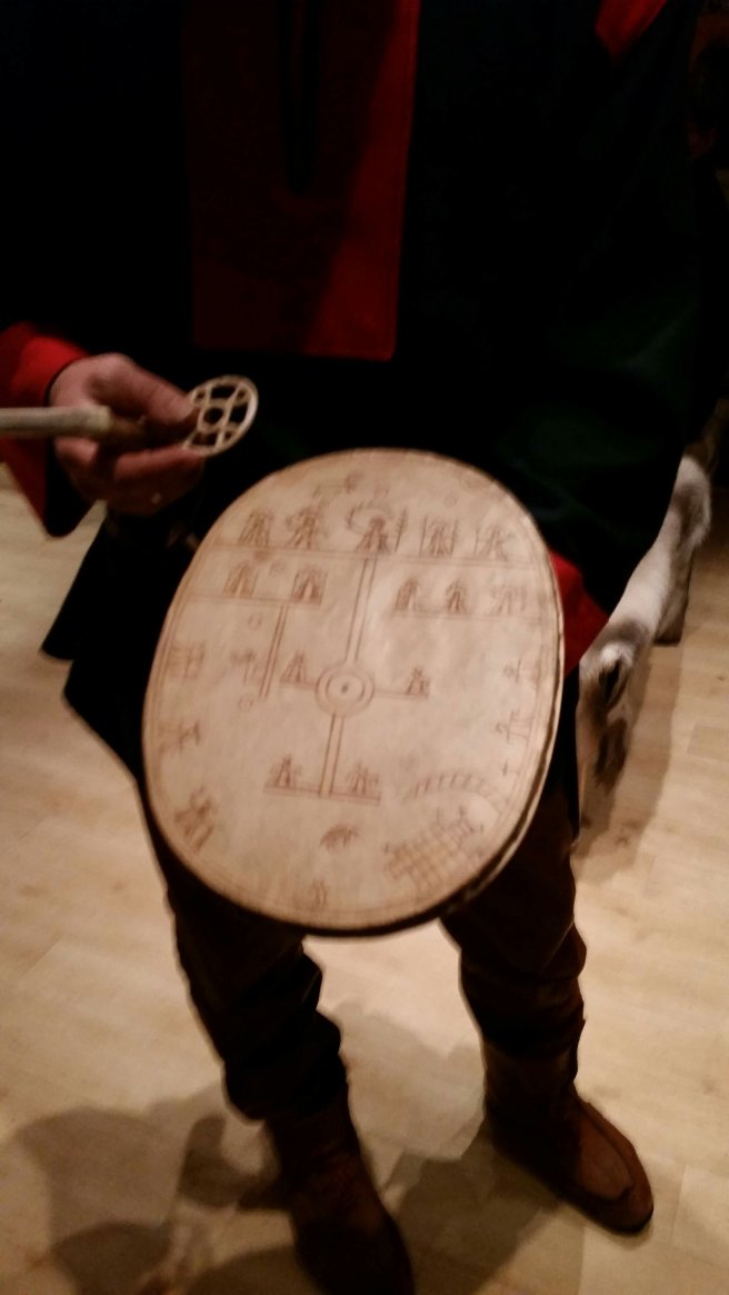 By this time, we were all pretty happy, but our host offered one more gift – a yoik (Sami folk song) accompanied by the sonorous tones of this traditional drum (the wafer-looking moves over the symbols as a sort of future predictor or seance board – best I could figure).