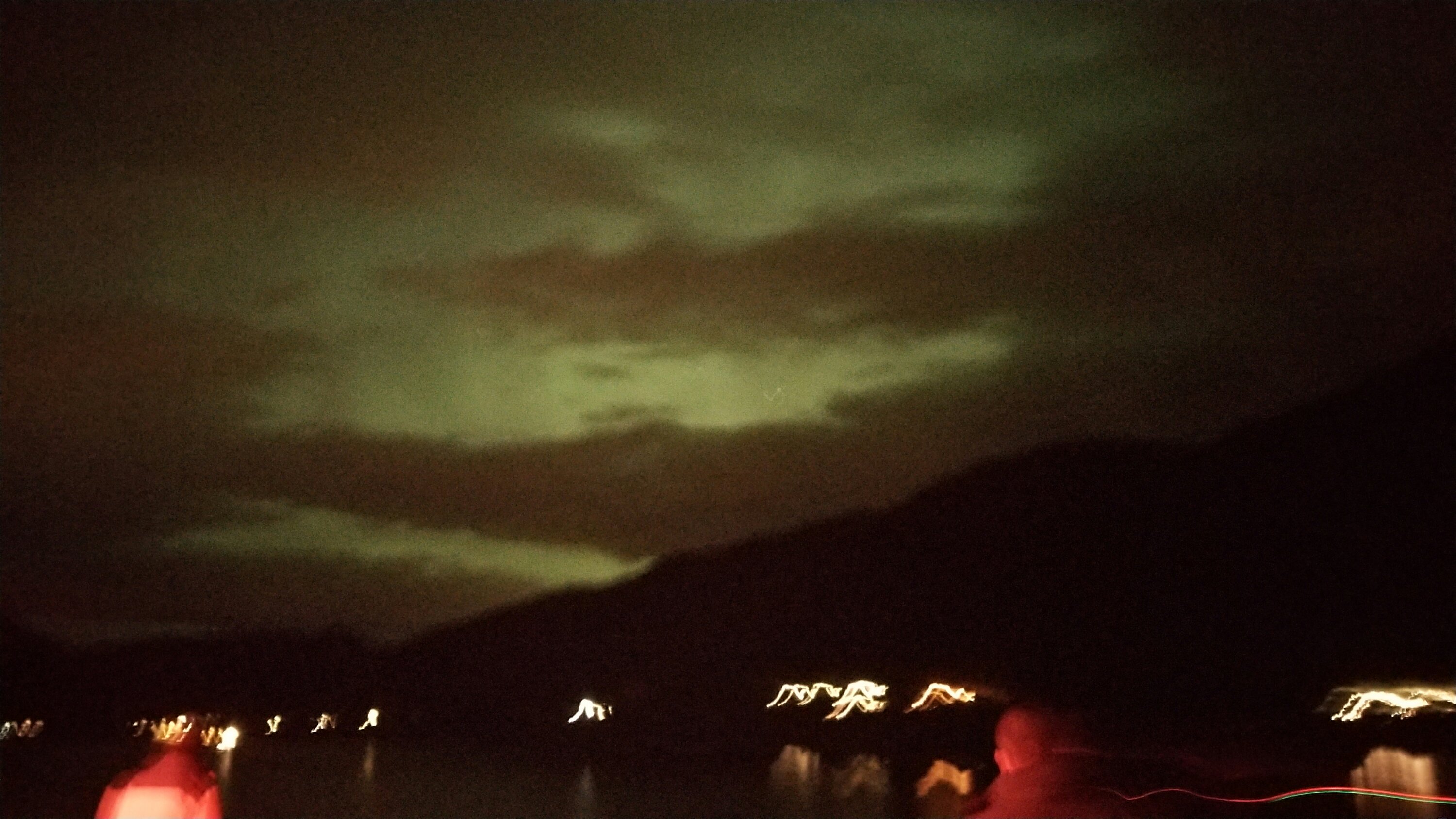 The squiggles at the bottom are of time exposed electric lights on the shore and the blurry reds are of people in front of the camera on the ship’s deck. David had brighter green shots that I could have chosen, but this paler colour is more like what our eyes actually saw aboard ship.