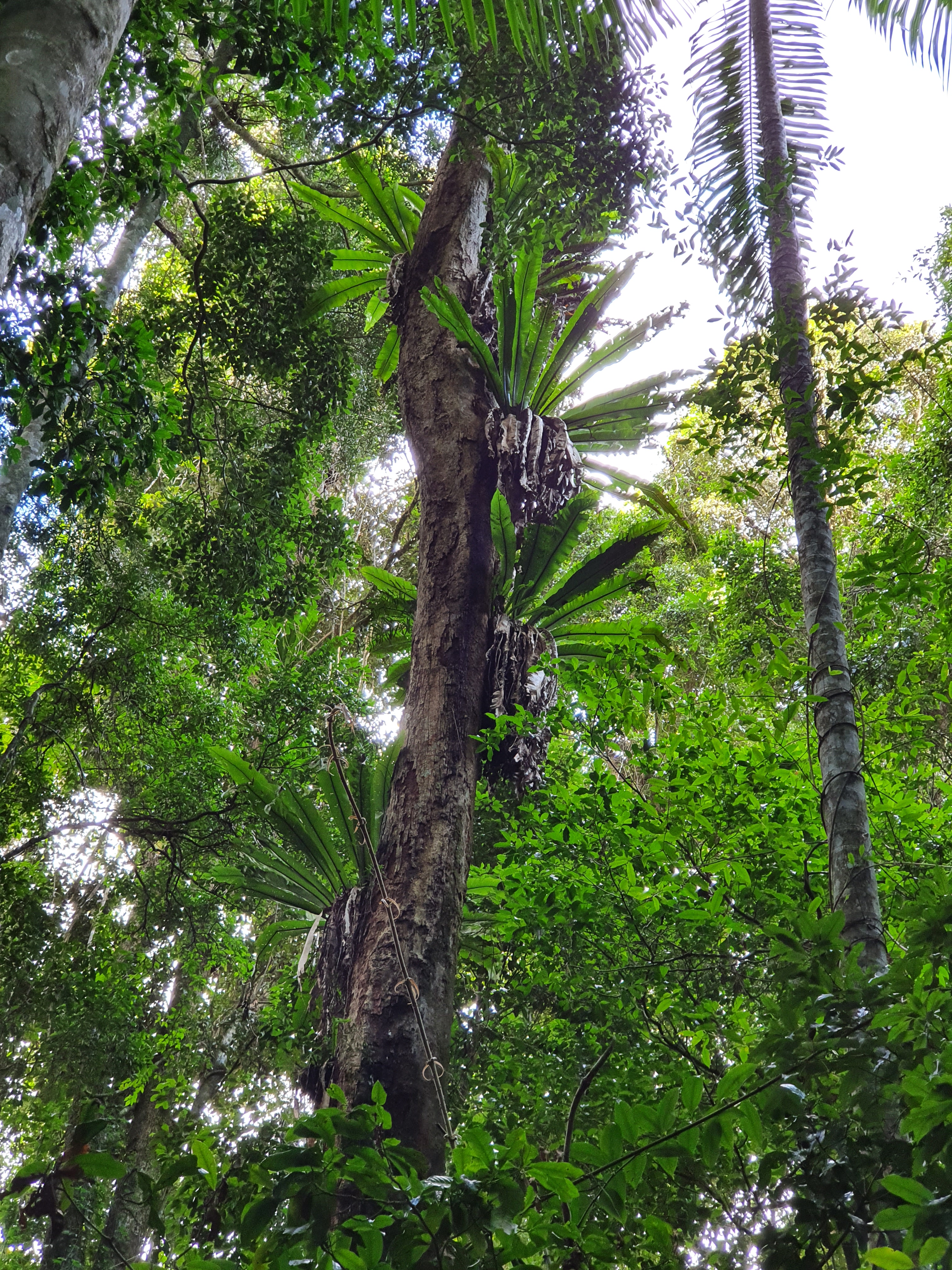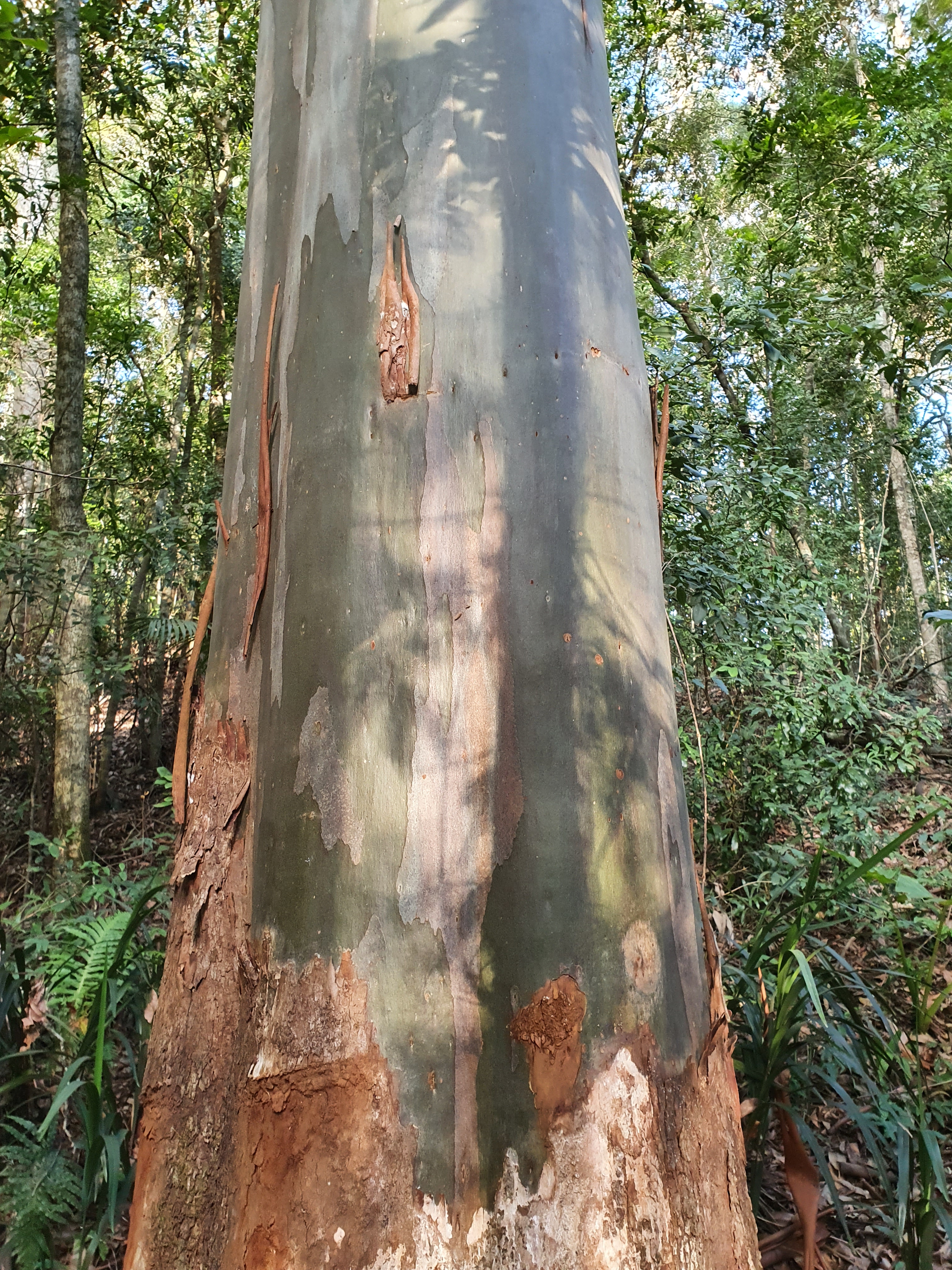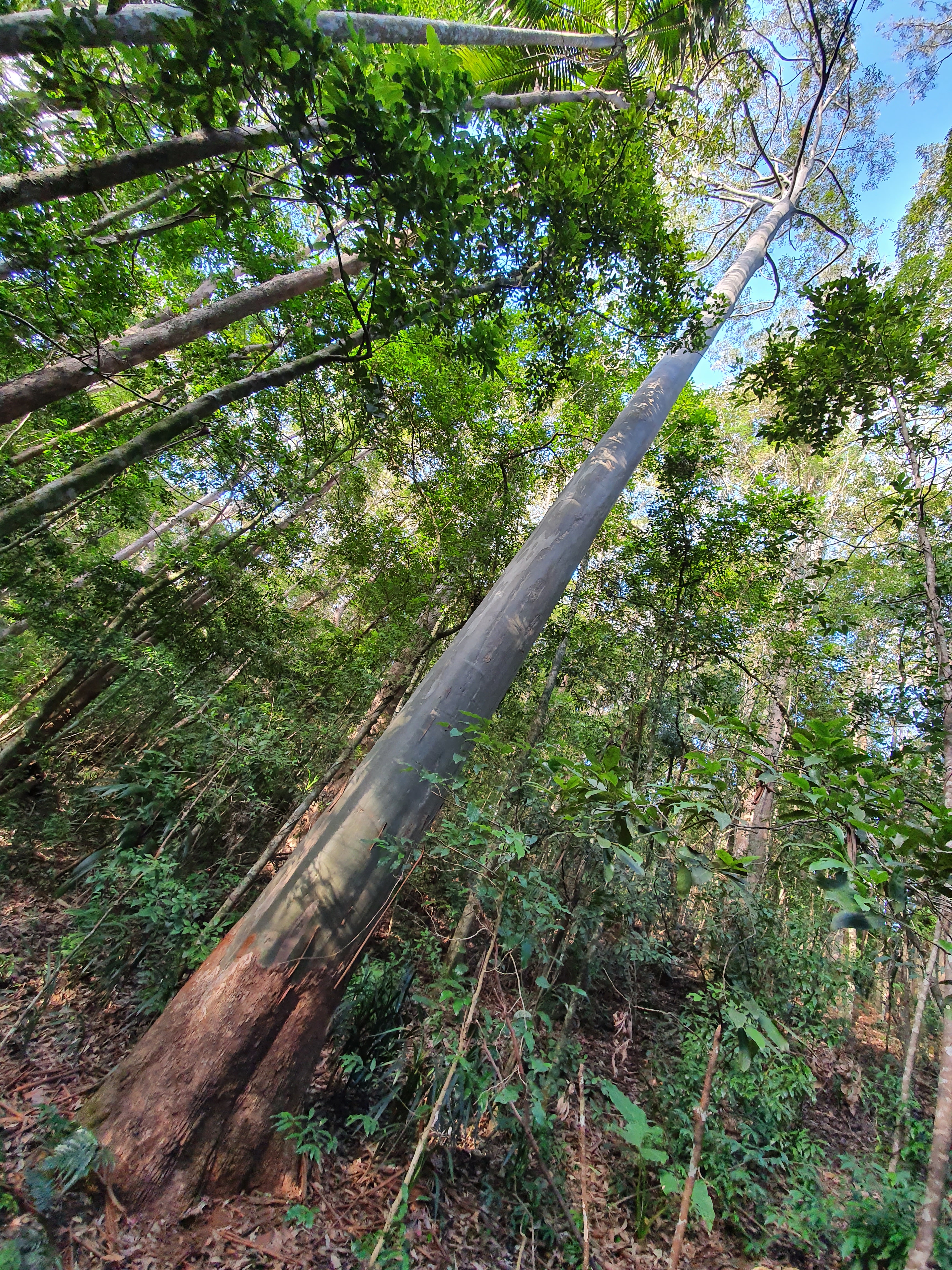 Eventually, the windy path leads back up to a drier section where the canopy is thinner and more spotted gum trees stretch high and wide.