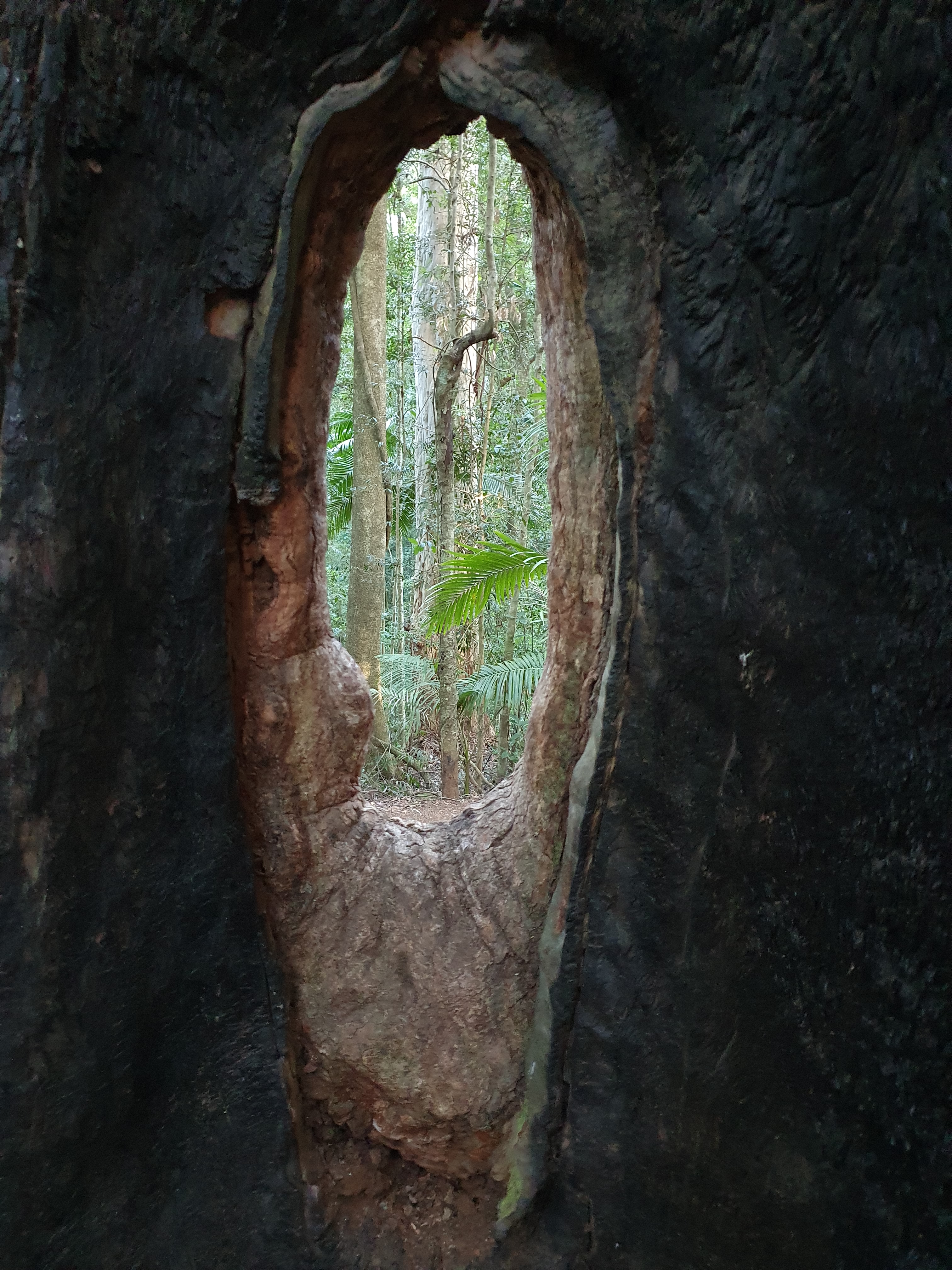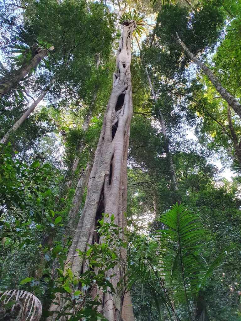 Follow the path for a good half hour, winding in generally a northerly direction from one steep creek gully to the next. There’s so much detail to see, you’ll want to take your time to look both up into the canopy and down into the moist leaf-litter where fungi hide and tiny birds scratch around in search of insects and seeds. I especially love tracing the intricate weave of the enormous fig trees that grow up around other trees, strangulating them as they grow and tighten, till they’re big and sturdy enough to stand on their own. The tree they’ve strangulated dies and rots away to land as mulch on the rainforest floor, leaving an empty space for the light to come shining through.