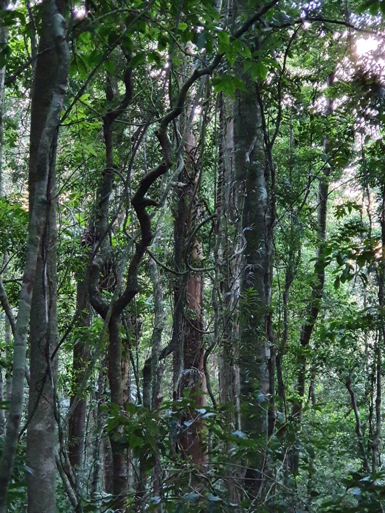 As it was going on 3 pm, I went anti-clockwise, taking the flight of wooden stairs down into the gully to briefly cross to the eastern side of a stream. Very quickly, the path enters a new, lush world, and modern life slips away. I savour the fresh air, the smells of loamy forest, and the sounds, and the living-energy of the place.